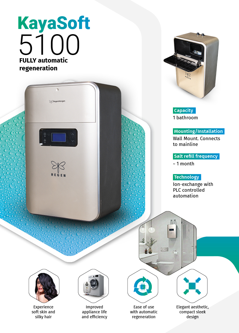 Every day, hard water silently damages your hair, skin, bathroom, your appliances, and even your family’s comfort. KayaSoft 5100 is designed to change that. Wall Mount, compact and elegant, it fits right into your bathroom and works 24/7 to give you soft, gentle water. With its PLC controlled automatic water softening operations, smart digital display, you’ll always know your water is being cared for—no stress, no guesswork.
